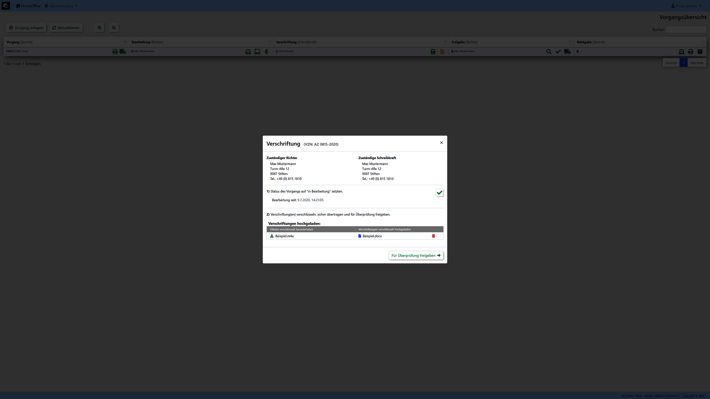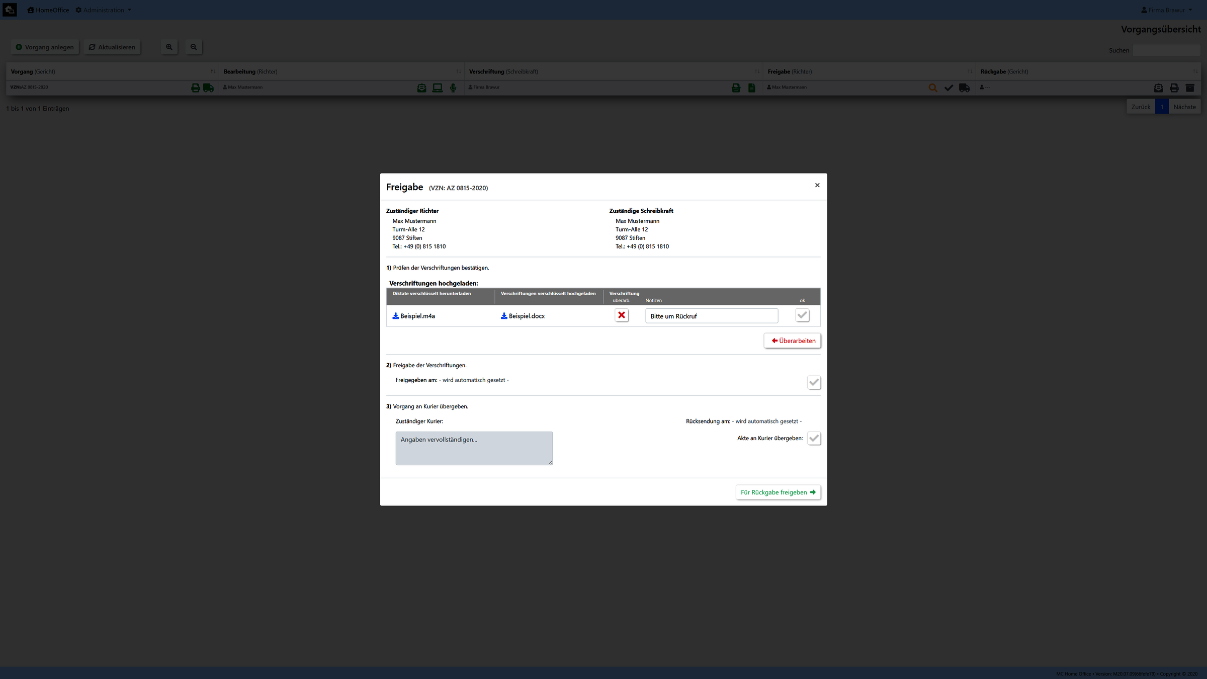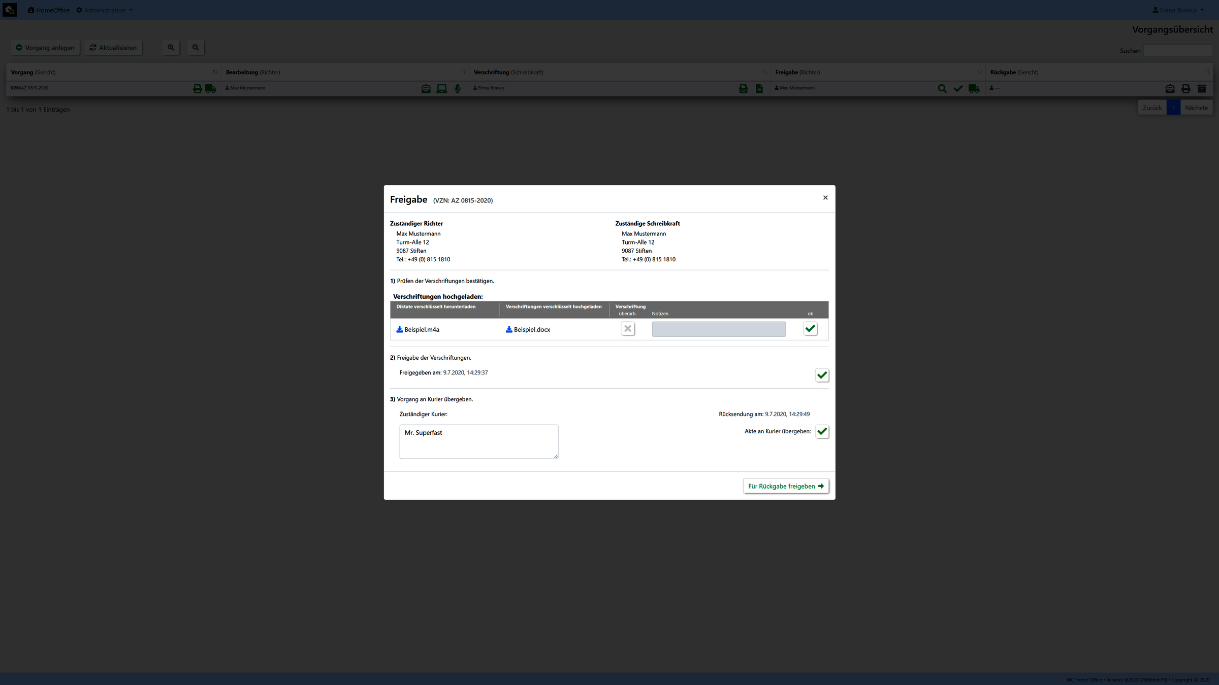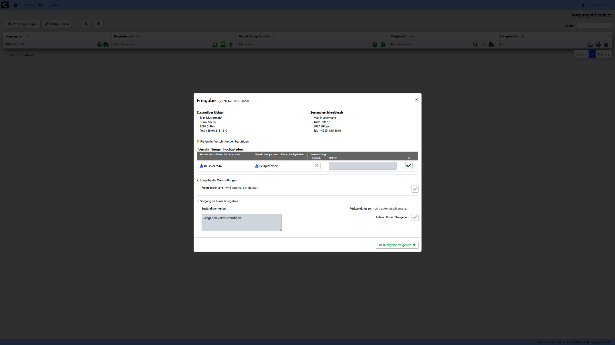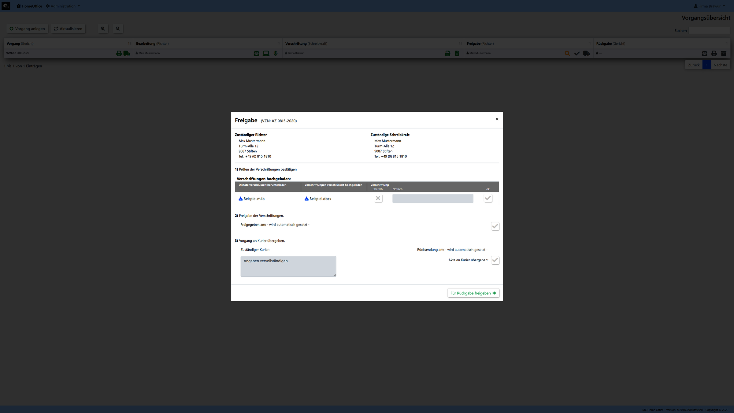Unsere Umsetzung wurde exemplarisch für den Arbeitsablauf eines Gerichtes realisiert. (Kann aber auf kundenwunsch auch an jedes andere Szenario angepassen bzw. umgesetzt werden.)