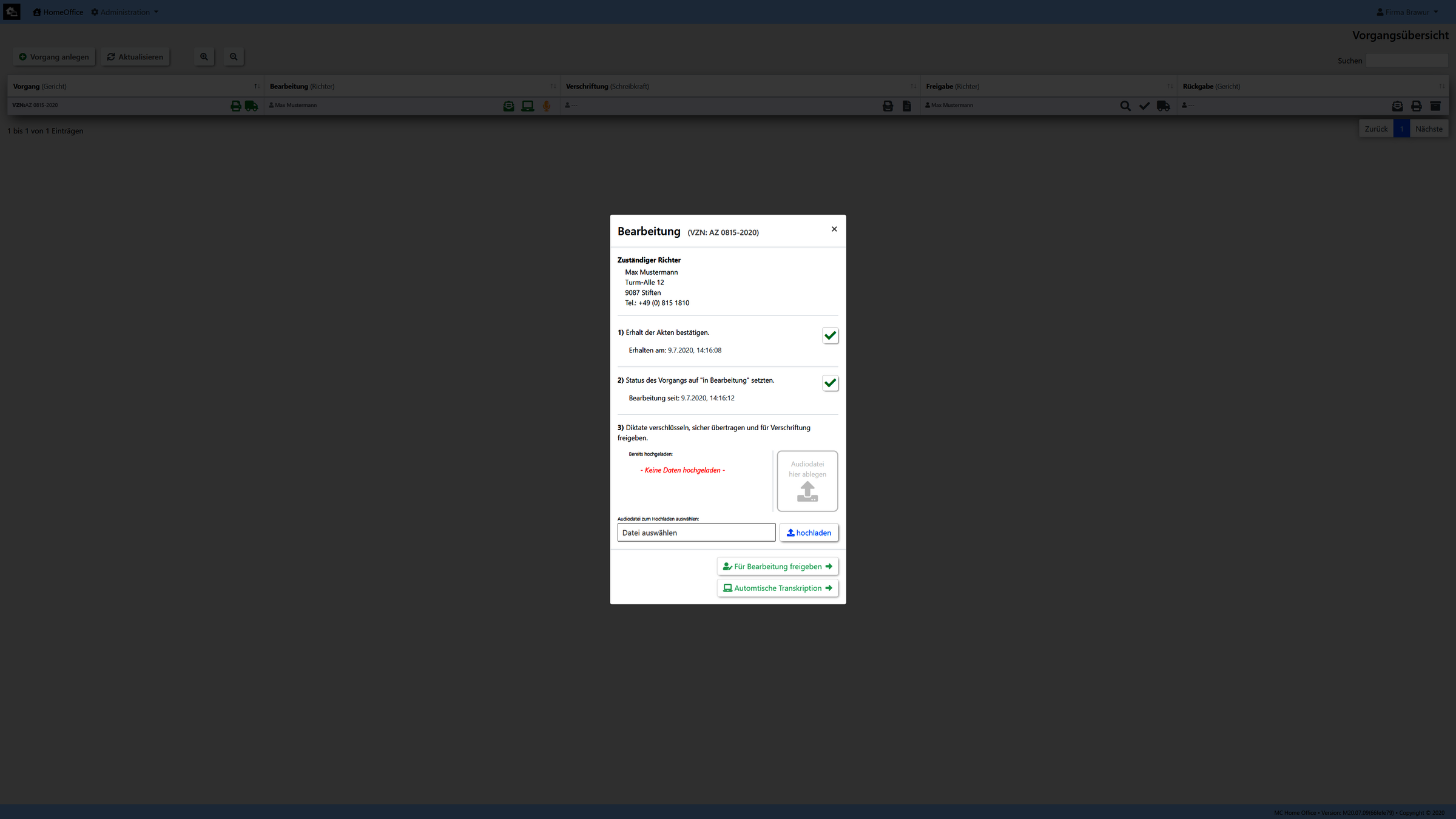 Hierzu werden alle relevanten Arbeitsschritte, von der Übersendung der Gerichtsakten per Kurier an einen Richter bis zur Ablage aller erstellten Schriftsätze zu dem Vorgangang in der Akte bei Gericht, von der Software vorgegeben und in einer Log-Dateil zusammengefasst und dokumentiert.